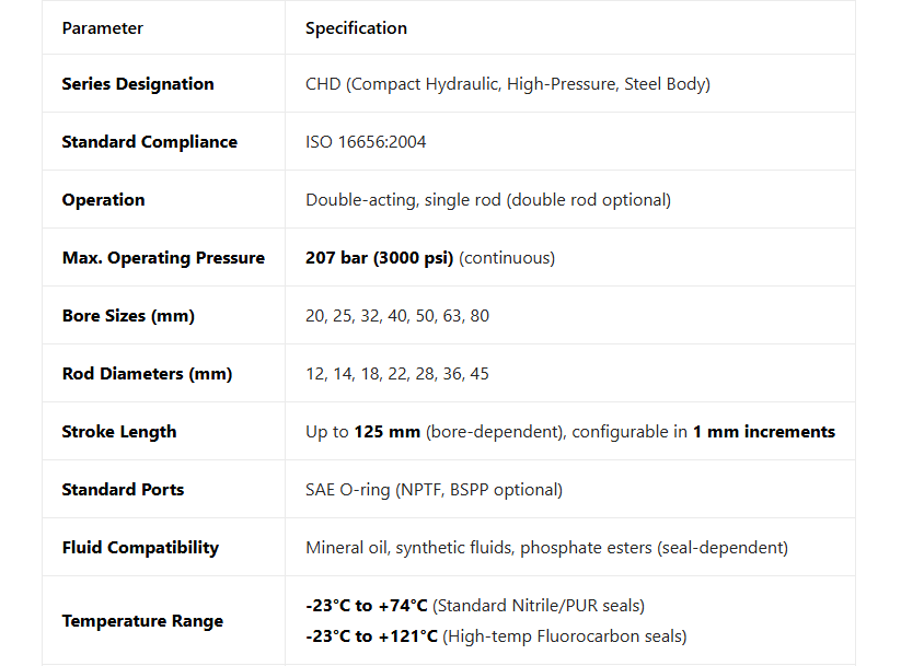 Parker CHD Series are metric, heavy-duty, steel-bodied compact hydraulic cylinders designed for high-force, short-stroke applications with operating pressures up to 207 bar (3000 psi). Built to ISO 16656:2004 standards, they offer exceptional durability and force density for demanding industrial environments.